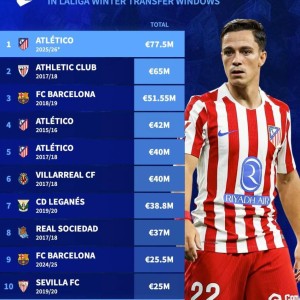 08 02月 2026 108 德转列西甲历史冬窗转会收入榜:本赛季马竞7750万欧元第1 北京时间1月17日,德转列出了西甲冬窗出售球员的历史收入榜,今年冬窗连续出售加拉格尔(4000万欧元)、拉斯帕多里(22... 西甲